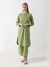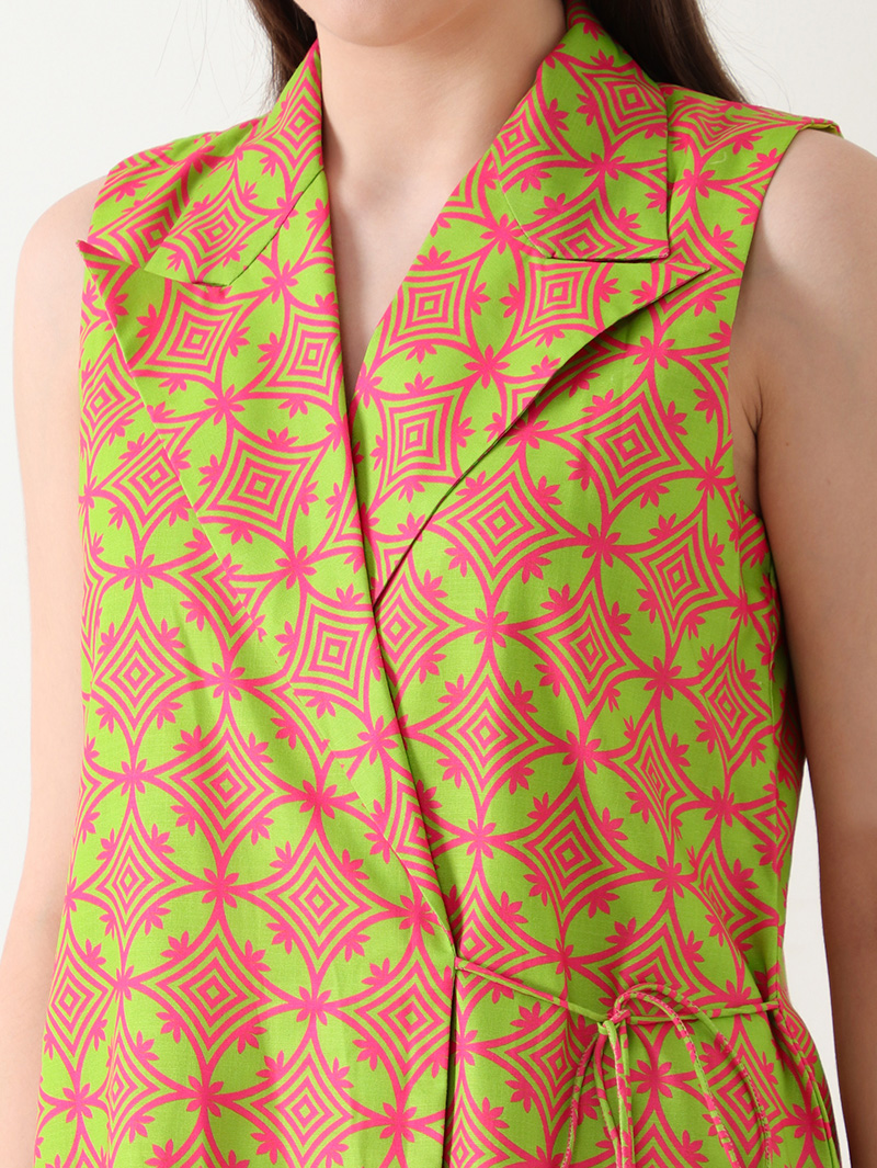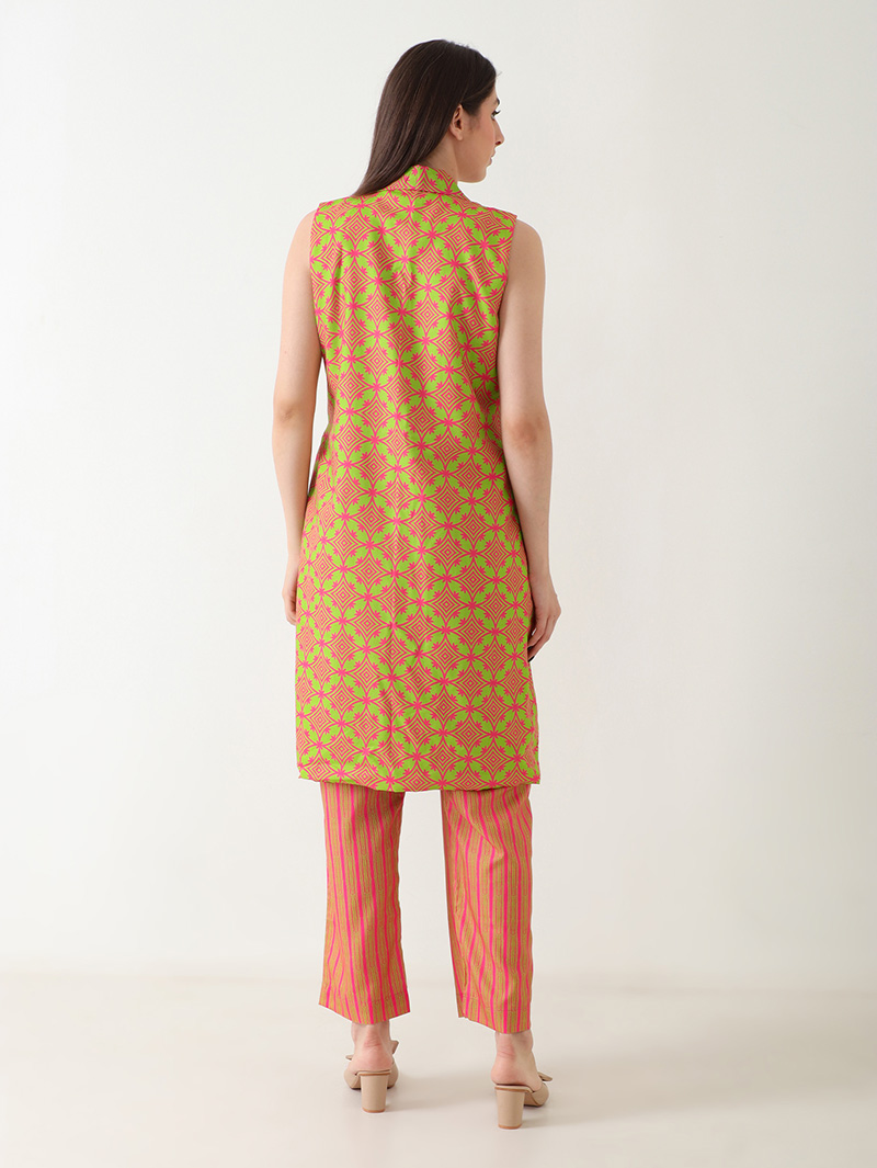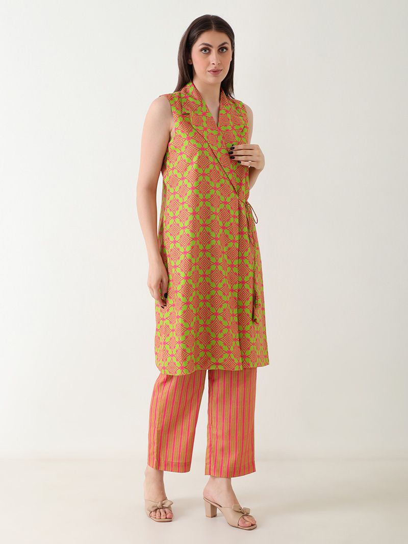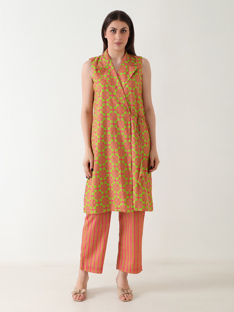 The Coral Gleam Linen Co-ord Set is a bold yet graceful fusion of color and comfort. Crafted from luxurious premium linen, this sleeveless co-ord features a wrap-style top with a collared neckline in vibrant coral and lime geometric prints. Paired with matching striped straight pants, it brings effortless sophistication to any occasion. Perfect for brunches, travel, or festive daytime events, this set defines contemporary elegance.