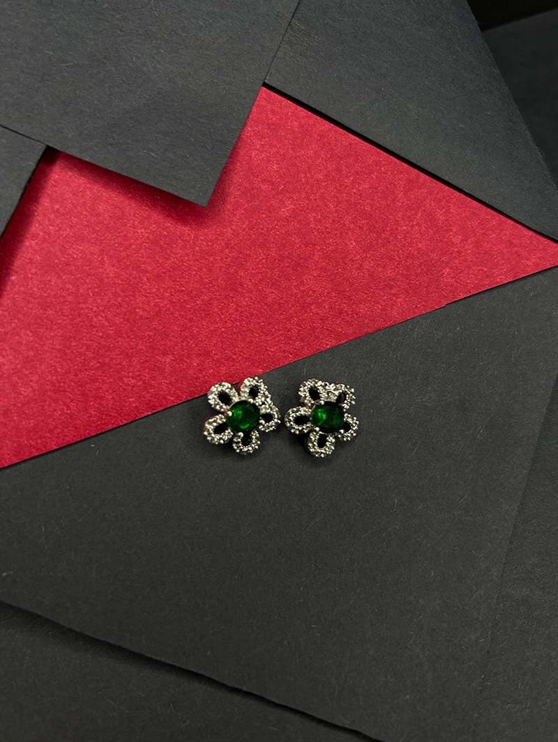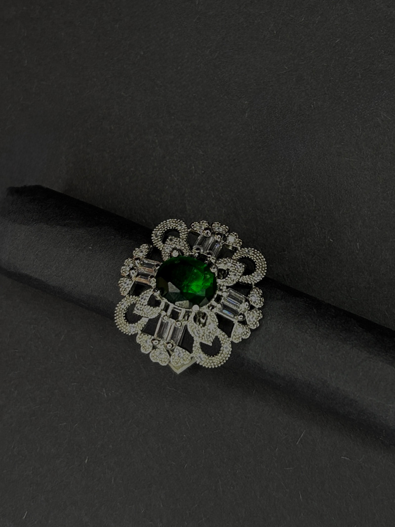 The Emerald Glow AD Stone Jewelry Set is a sophisticated and versatile accessory set crafted for modern elegance. It includes a pair of floral stud earrings, a statement ring, and a sleek bracelet. Each piece is embellished with sparkling AD (American Diamond) stones and centered with deep emerald green stones that create a bold contrast against the silver finish. Perfect for cocktail parties, festive occasions, or evening celebrations, this set adds a touch of luxury and timeless charm to any look.