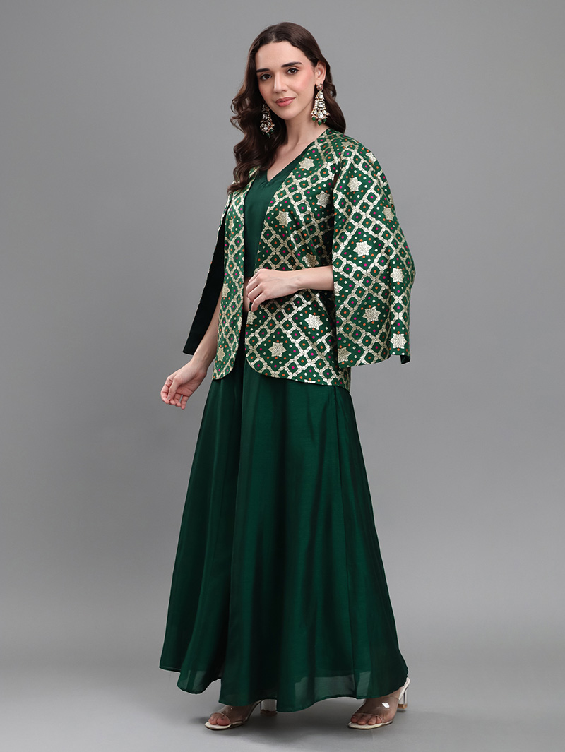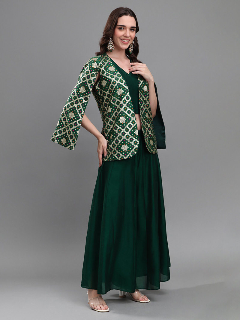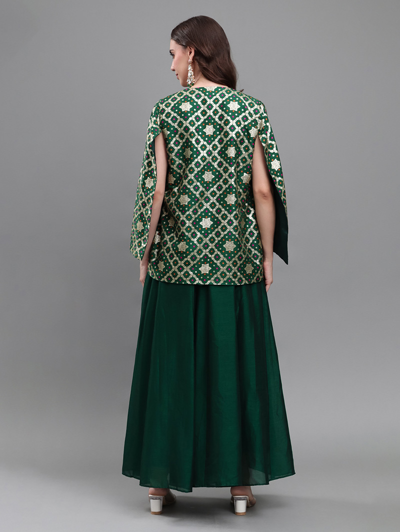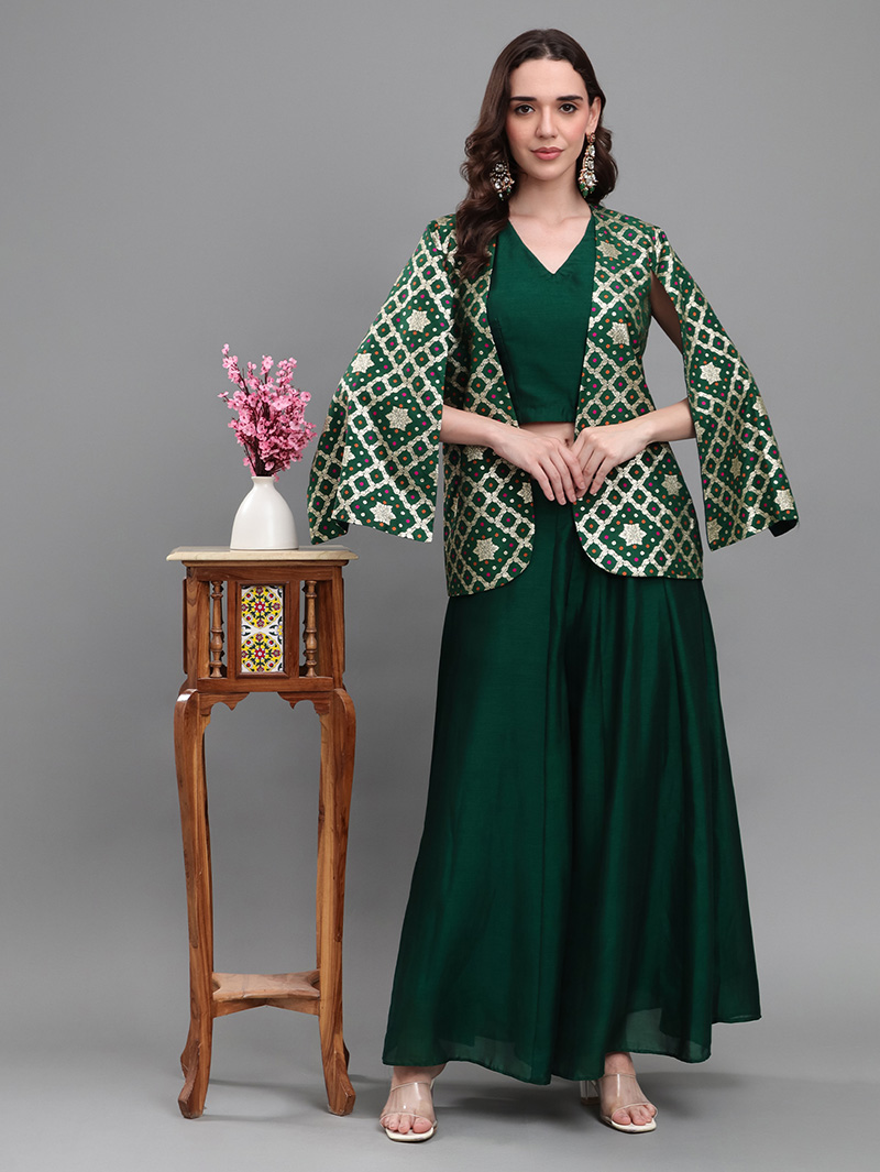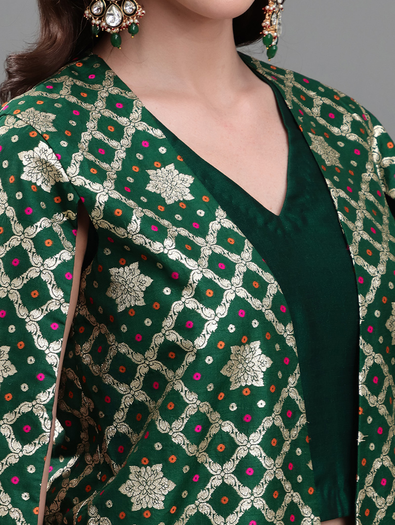 The Emerald Royale 3-Piece Set is a stunning fusion of luxury and elegance. The rich brocade cape-style jacket features intricate woven patterns in emerald and gold, creating a regal festive appeal. Paired with a solid georgette silk crop top and wide-flare georgette silk palazzos, this ensemble delivers a perfect blend of tradition and modern glamour. Ideal for weddings, receptions, sangeet nights, and festive occasions.