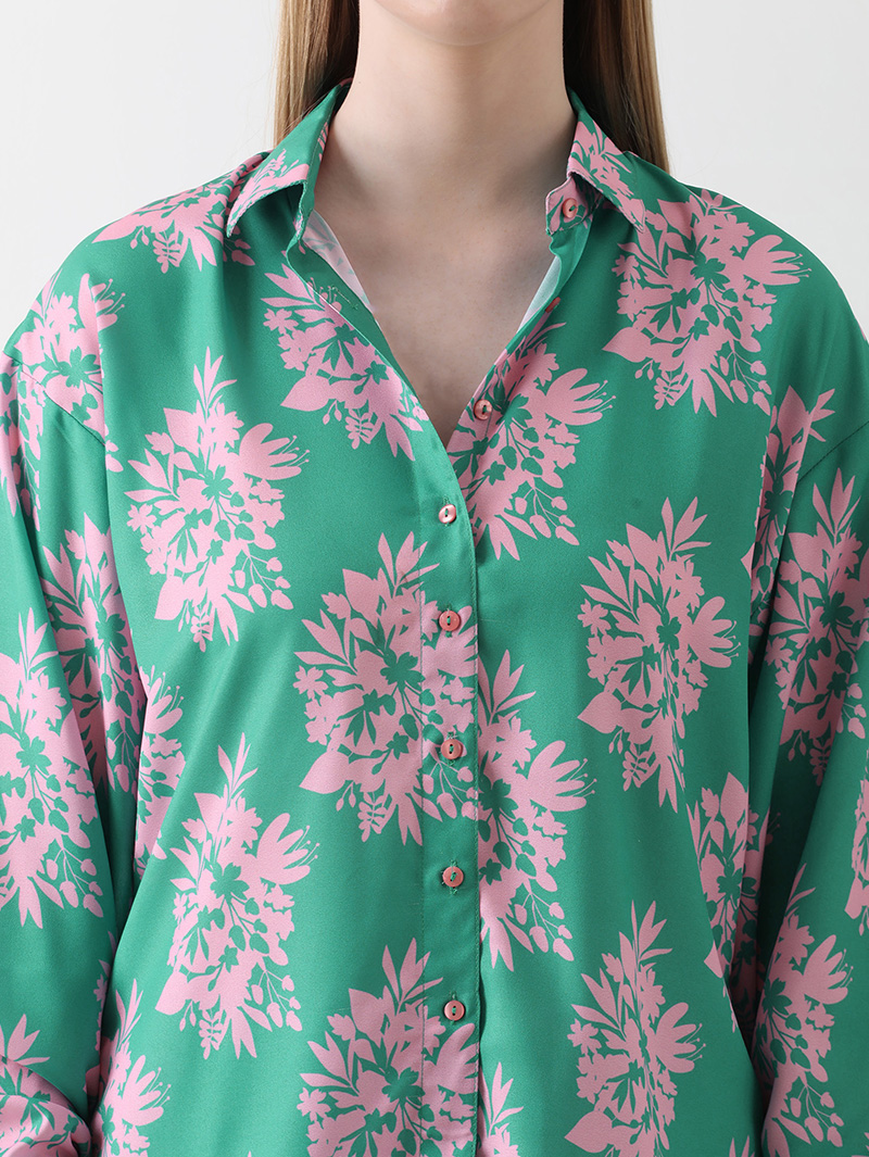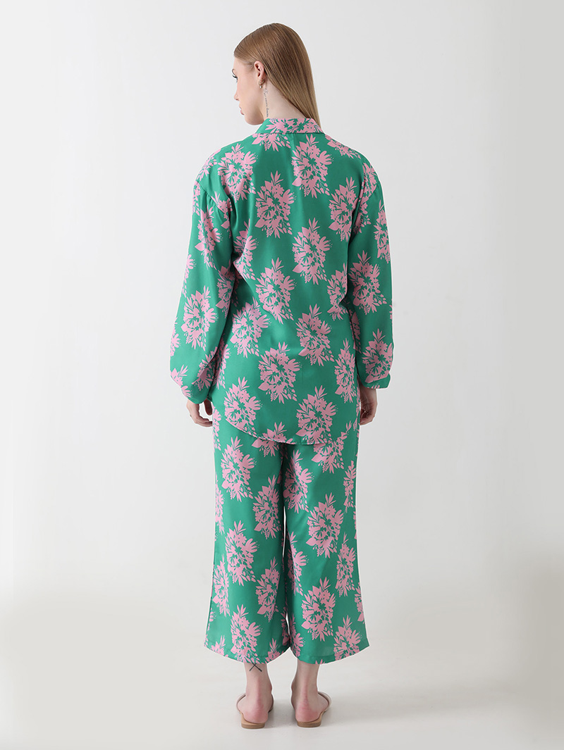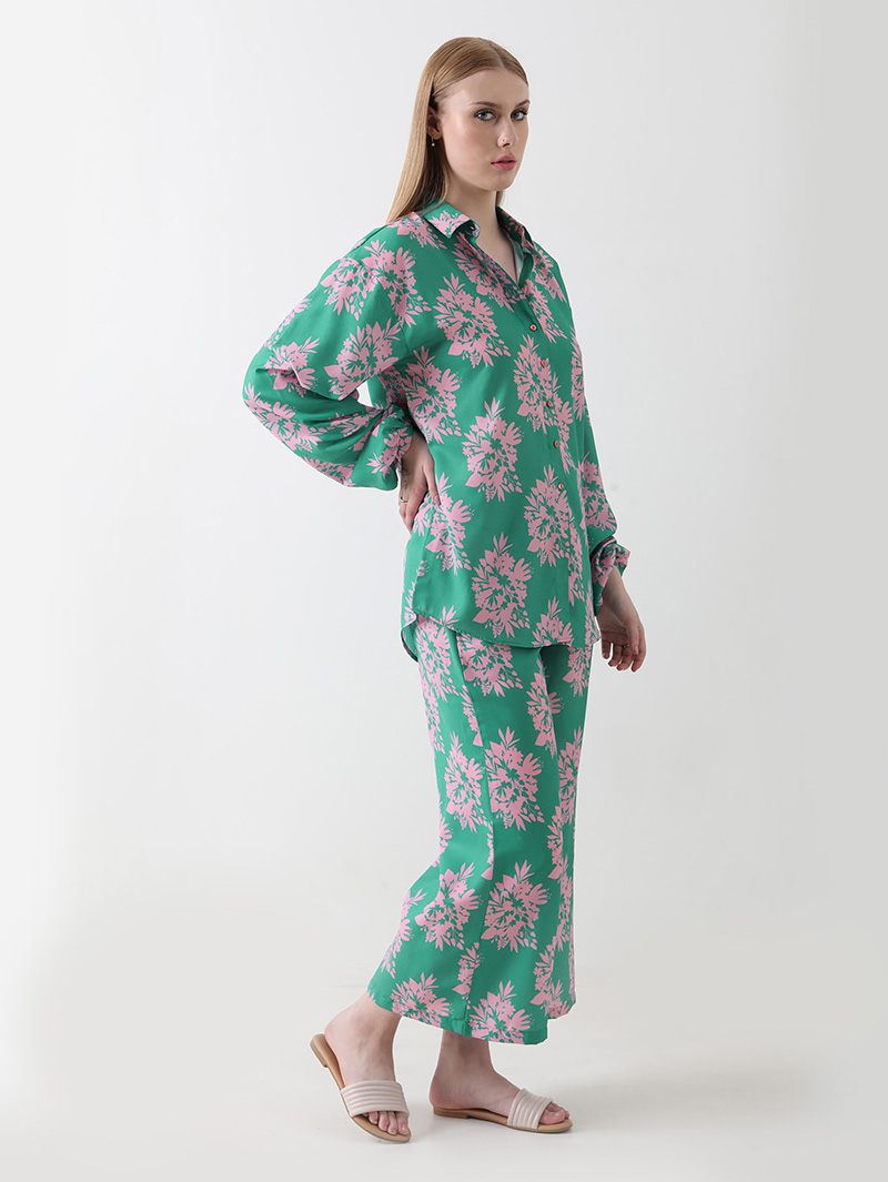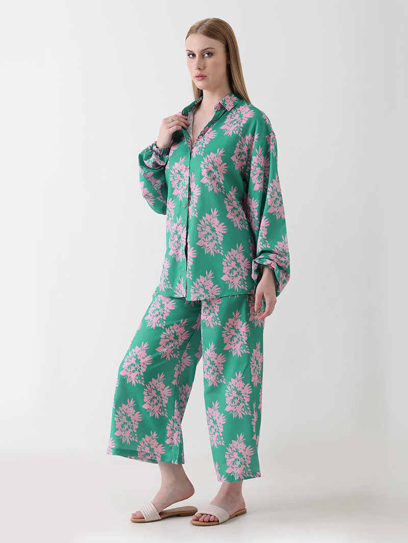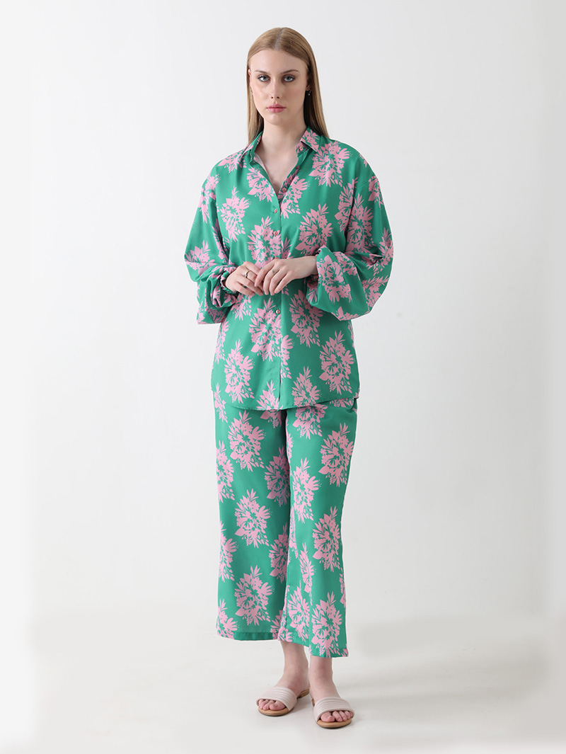 The Mint Blossom Georgette Co-ord Set brings together effortless elegance and comfort. Crafted from premium georgette, this ensemble features a soothing mint-green base adorned with delicate pink floral motifs. The full-sleeve button-down shirt and relaxed-fit pants create a flattering, airy silhouette — perfect for brunches, vacations, or everyday sophistication.
