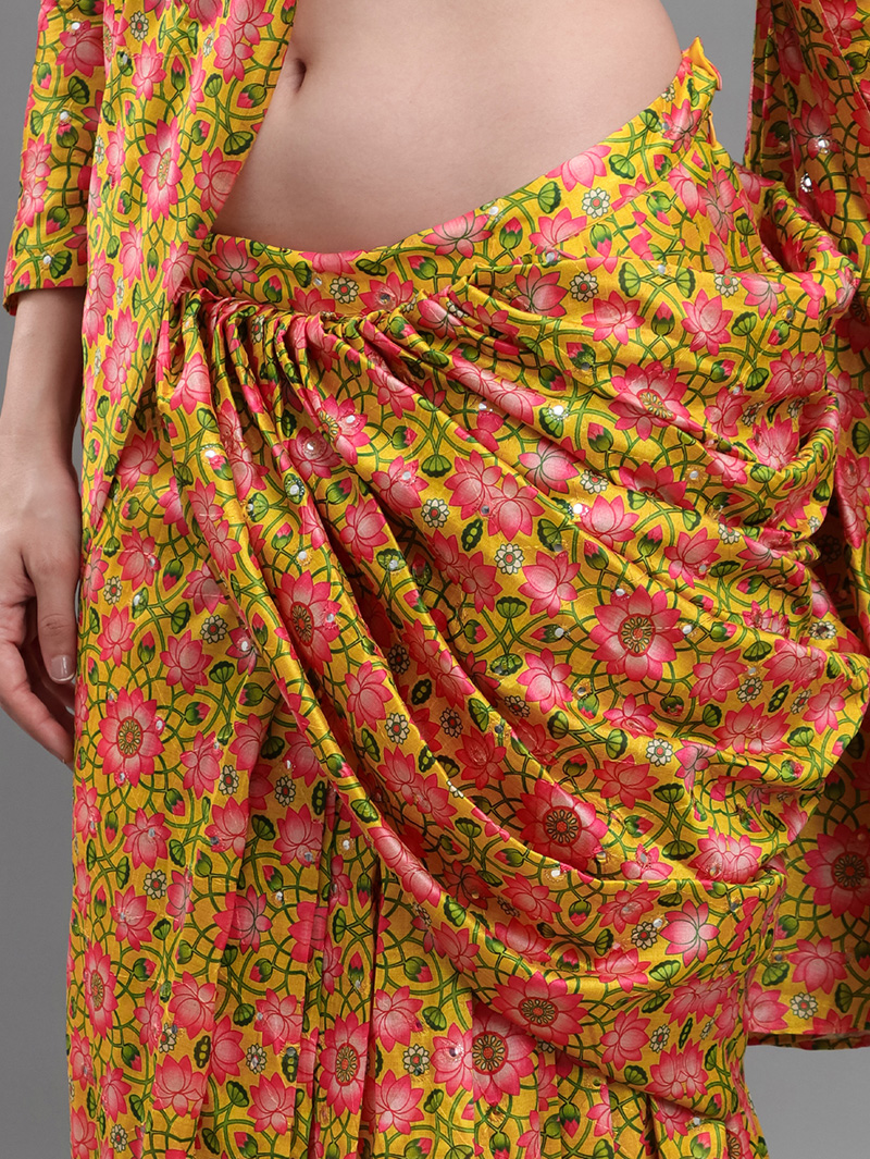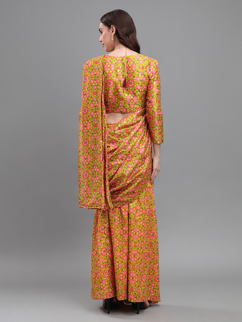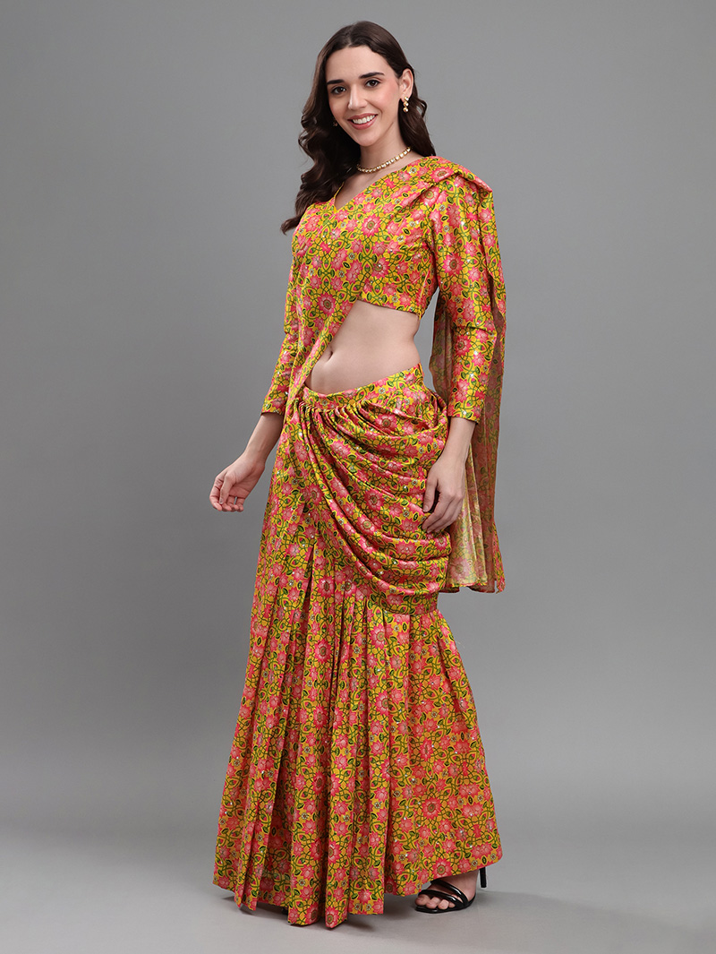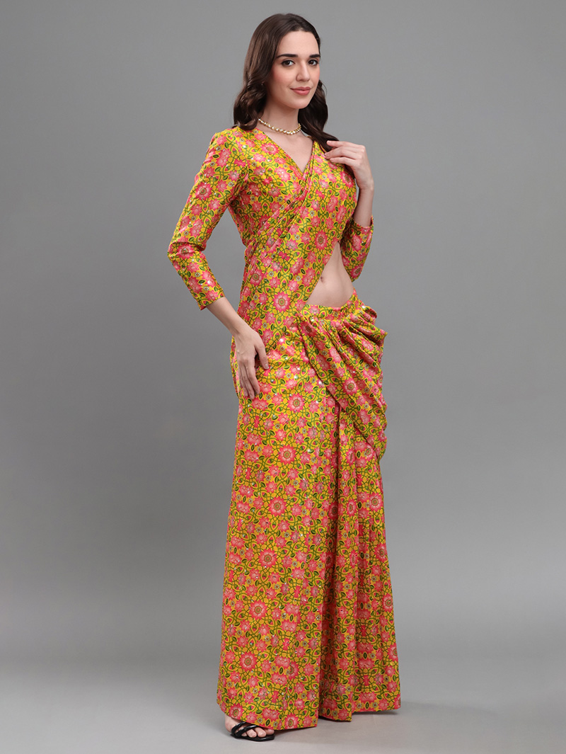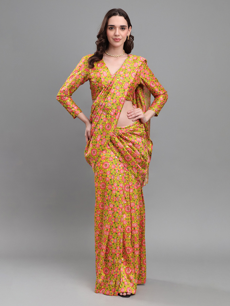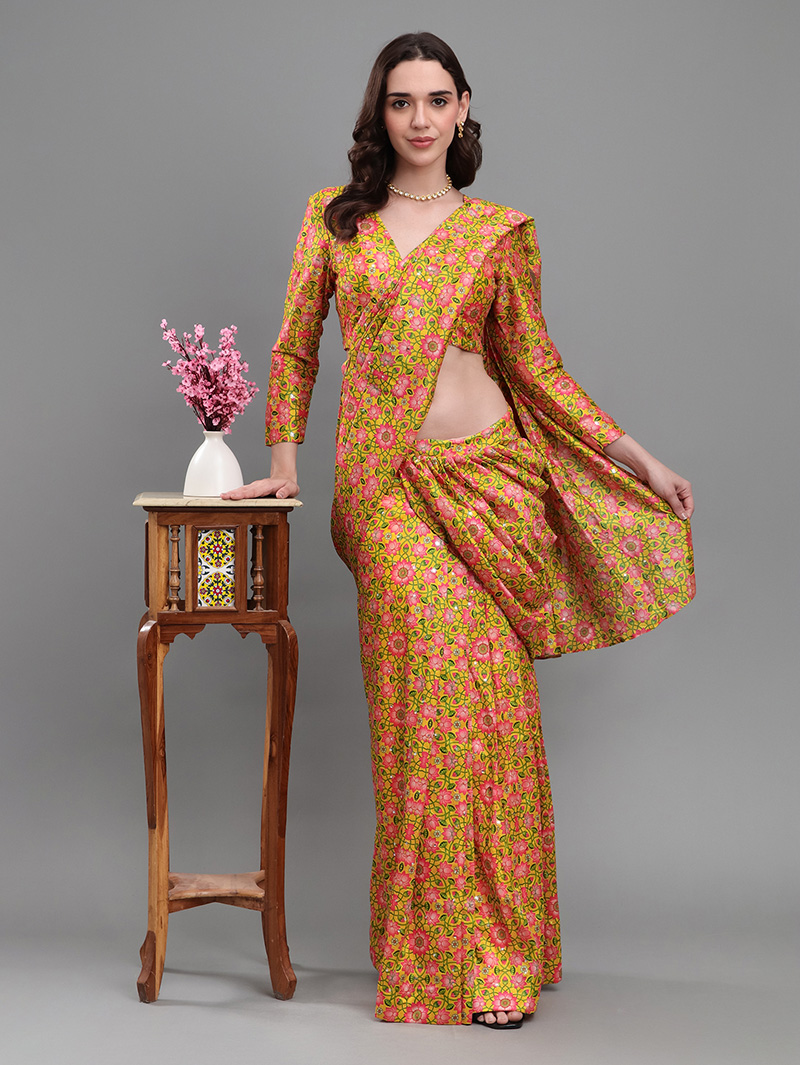 The Mirror Bloom Banana Silk Saree brings effortless elegance with its vibrant floral design and luxurious drape. Crafted from premium banana silk, this ready-to-wear saree features all-over mirror work that adds shimmering festive charm. The pre-stitched design ensures easy draping and perfect pleats in minutes. Paired with a matching blouse, it is ideal for weddings, festive functions, and evening celebrations.