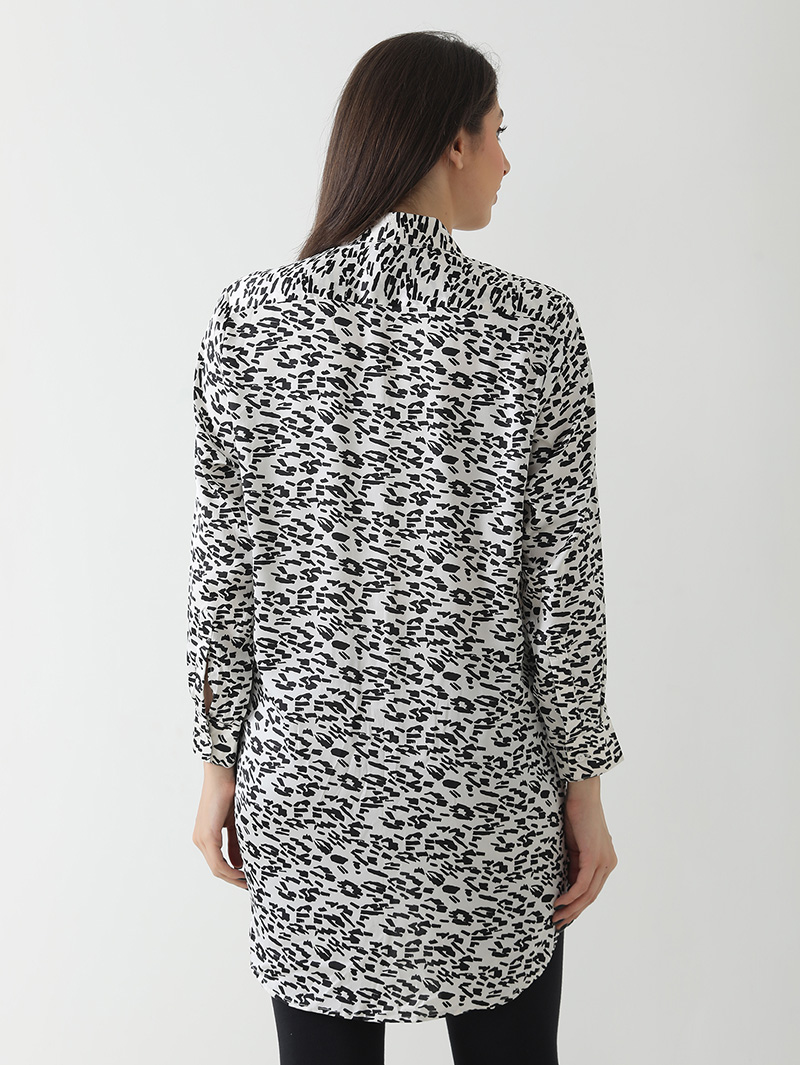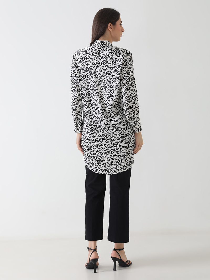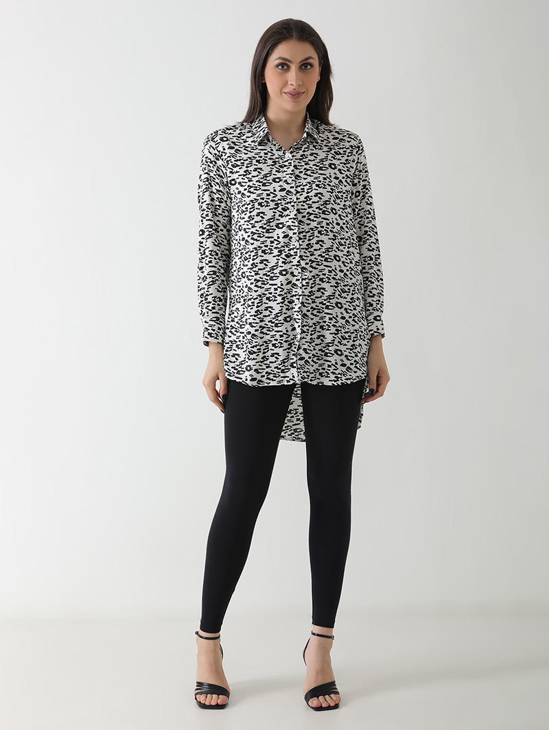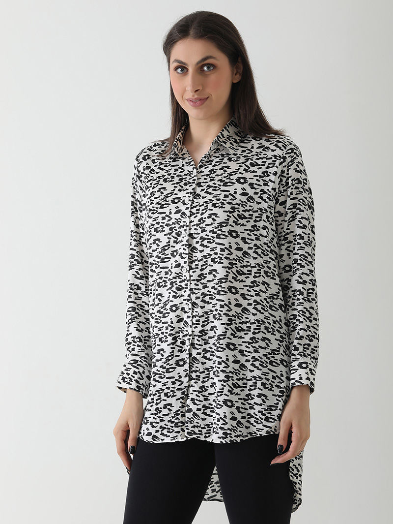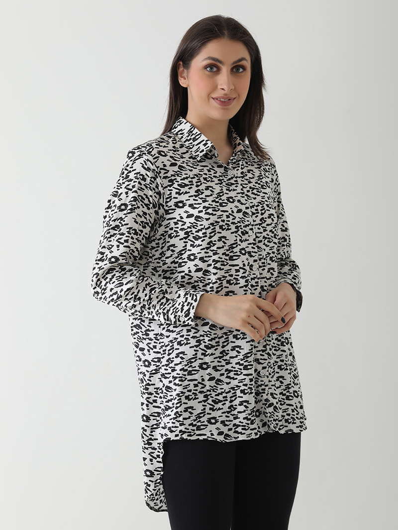 The Monochrome Animal Print Long Shirt is a chic and versatile wardrobe essential. Crafted in lightweight, breathable fabric, it features a classic collared neckline, button-down front, and long sleeves. The black and white animal print design adds a bold yet elegant touch, while the high-low hemline gives it a modern silhouette. Perfect for pairing with trousers, jeans, or layering for a smart-casual look, this shirt offers effortless style for both office and outings.