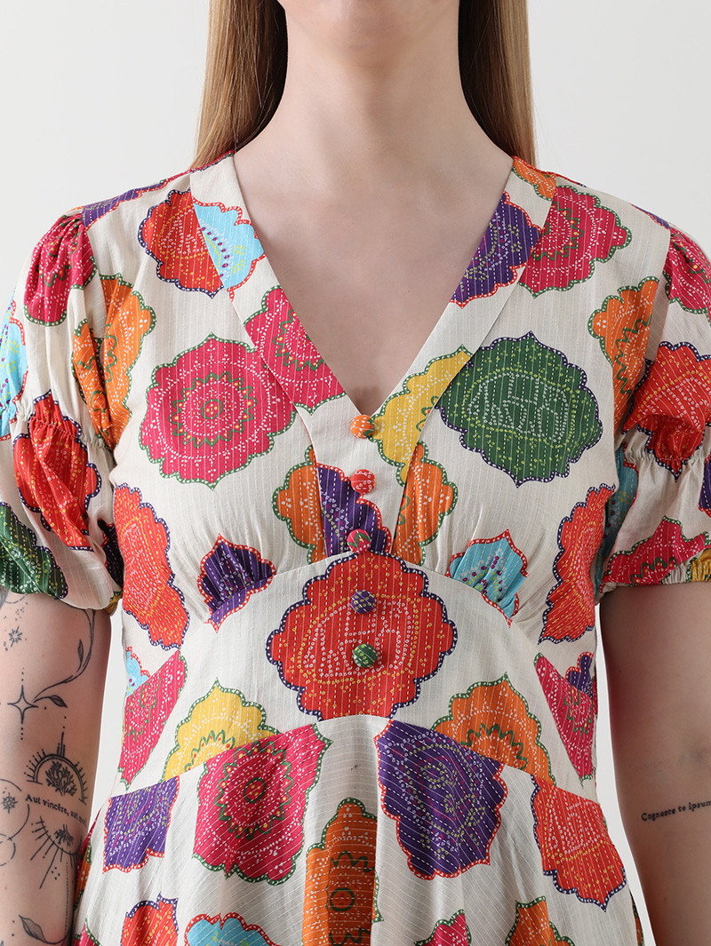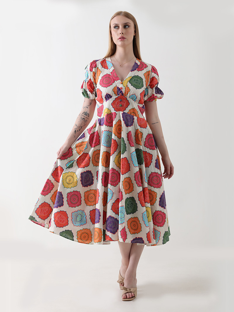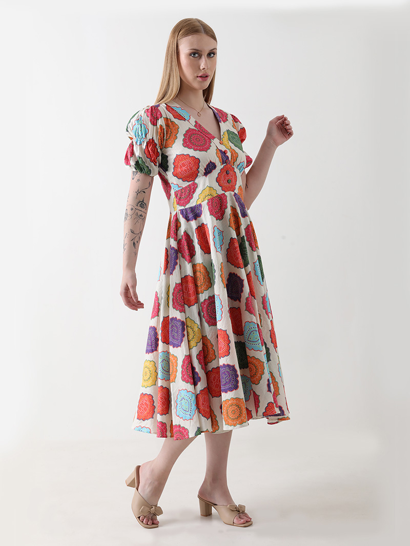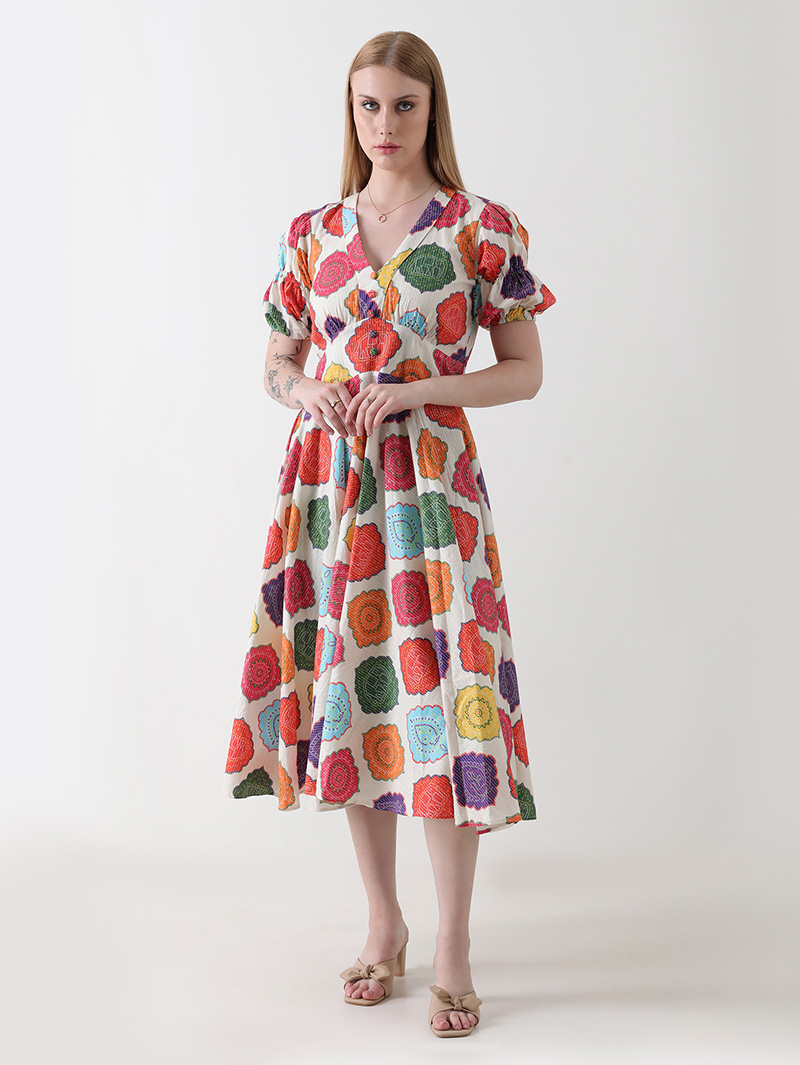 A cheerful midi dress in pure linen, covered with oversized multicolor floral motifs.