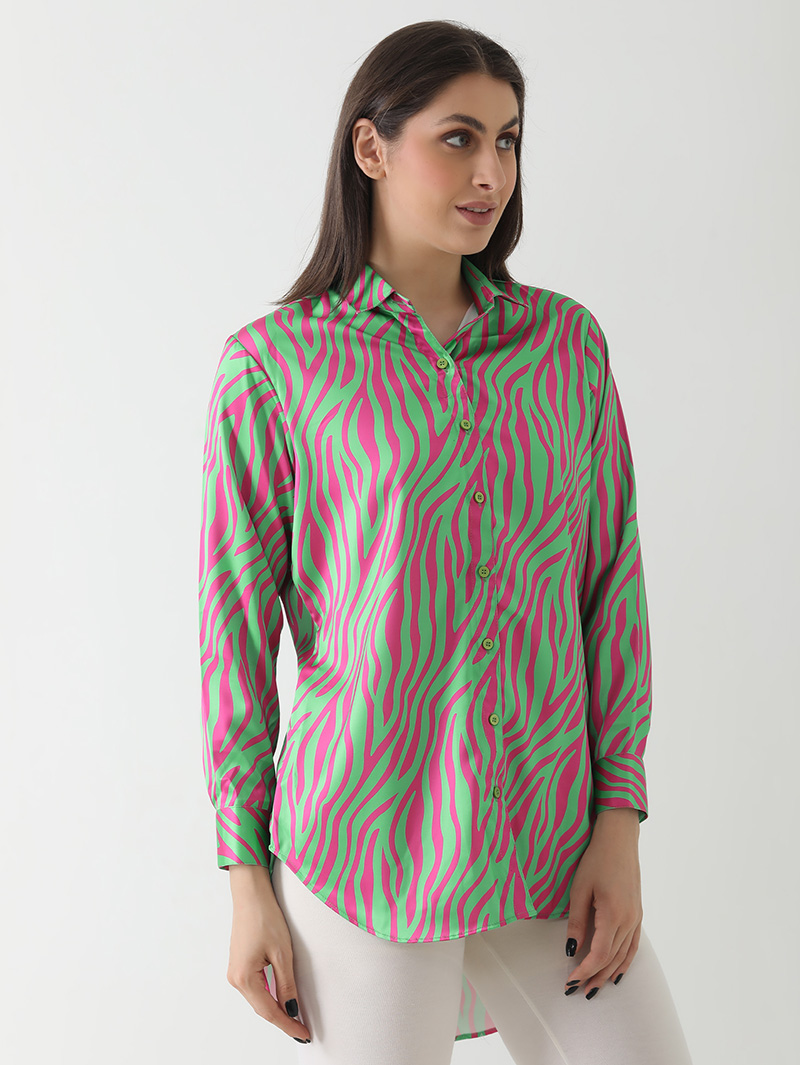 The Neon Zebra Print Satin Shirt is a statement-making piece designed for trendsetters. Featuring a striking pink and green zebra-inspired pattern on a satin base, it combines bold style with luxurious comfort. The shirt is tailored with a collared neckline, button-down front, and full sleeves, giving it a modern yet versatile look. Perfect for parties, casual outings, or stylish daywear, this shirt adds a pop of personality to any wardrobe.