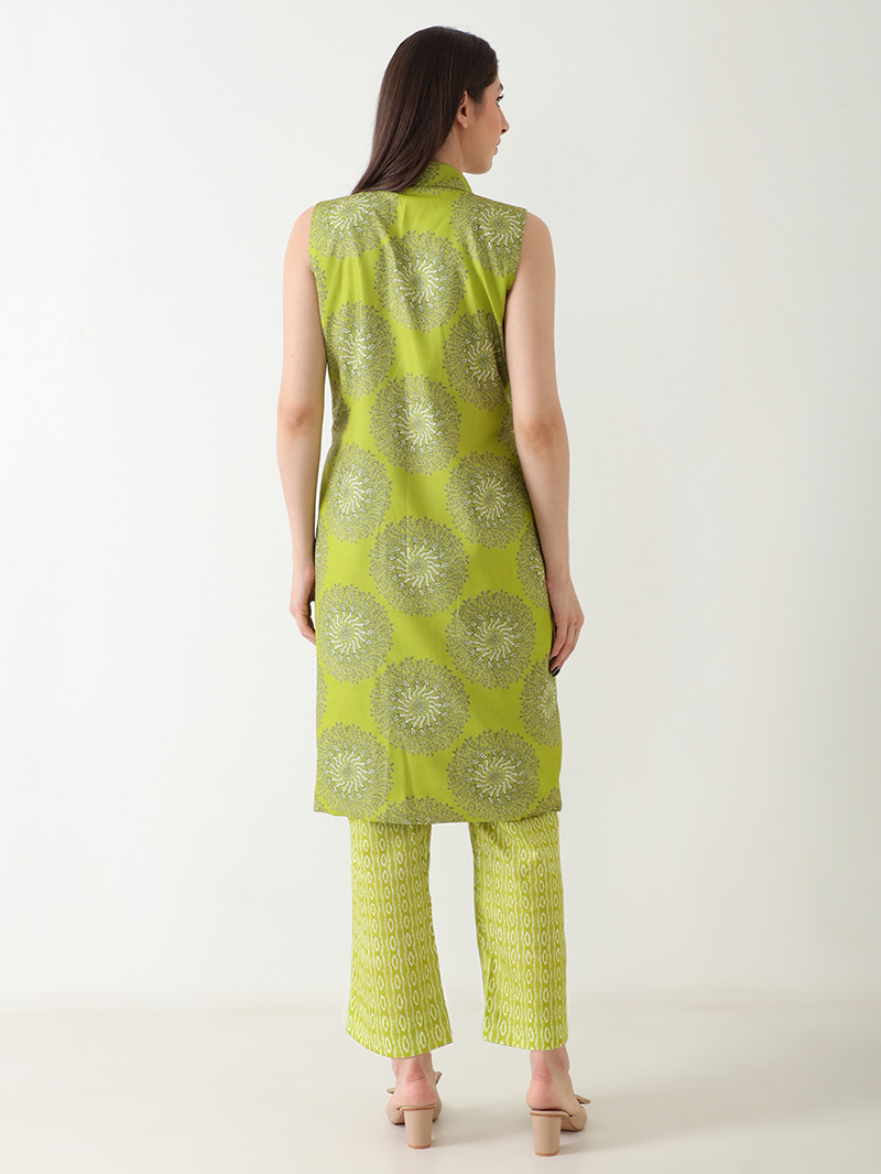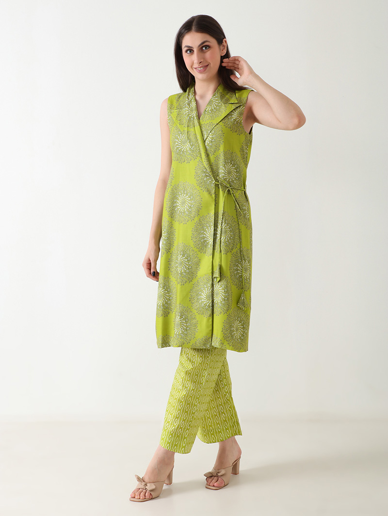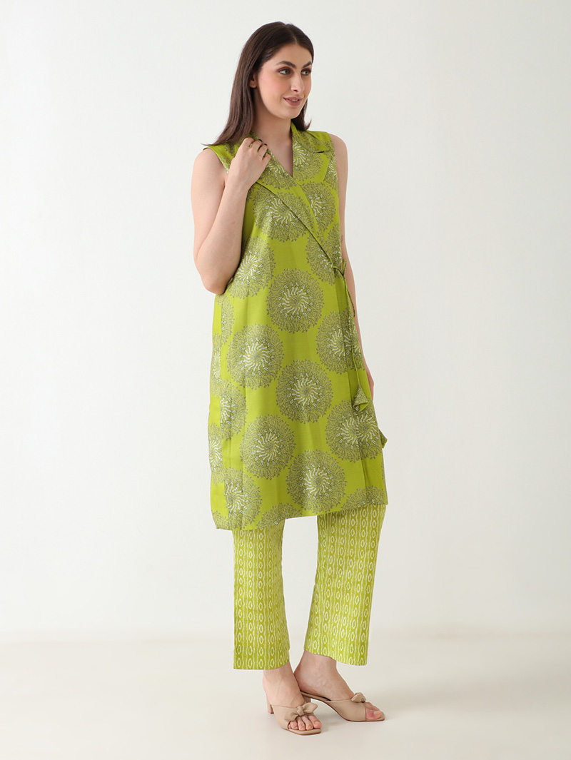 The Olive Grace Linen Co-ord Set is a perfect blend of contemporary elegance and natural comfort. Crafted from luxurious premium linen, it features a soothing olive-green base with artistic circular prints. The sleeveless wrap-style top with a lapel collar and tie-up belt pairs effortlessly with coordinated printed pants, creating a stylish yet relaxed silhouette. Ideal for summer brunches, casual gatherings, or day events where comfort meets sophistication.