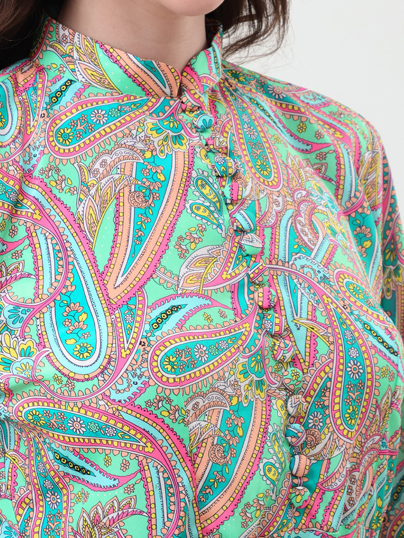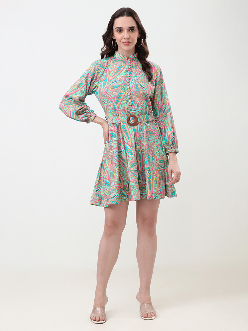 A paisley patterned linen mini dress with a belted waist and flared hemline.