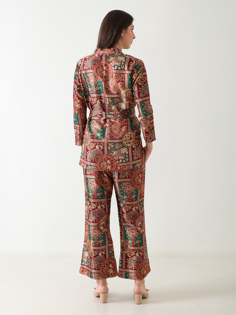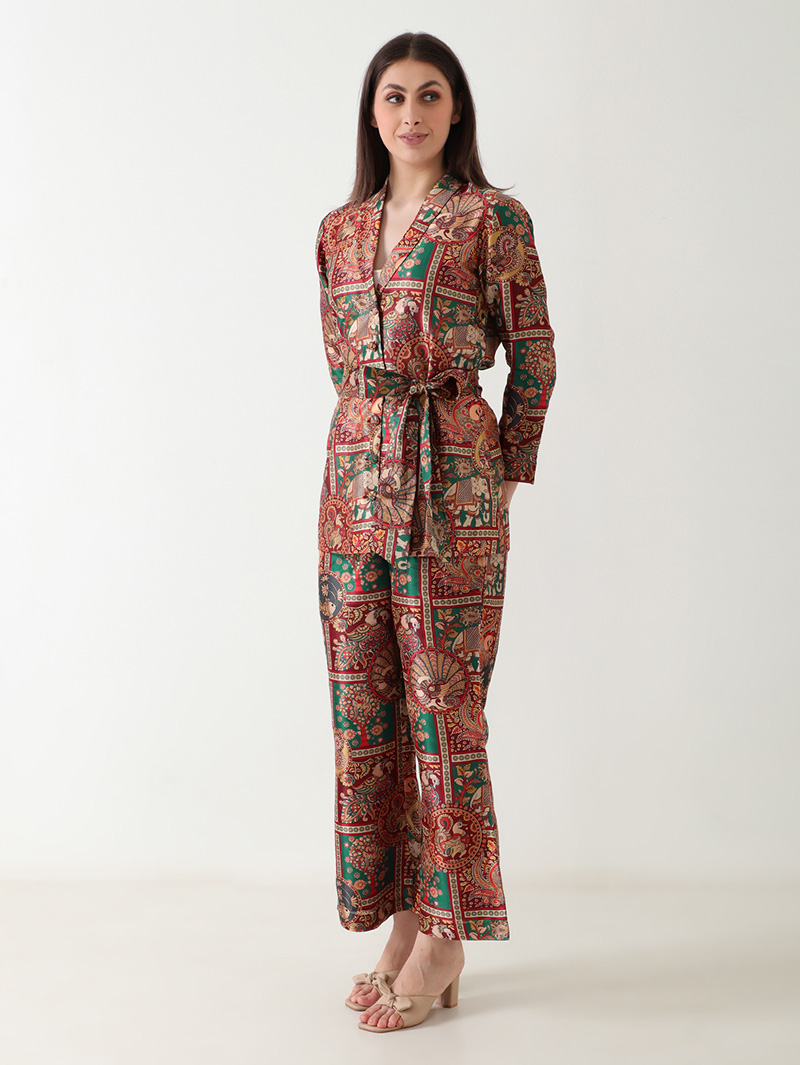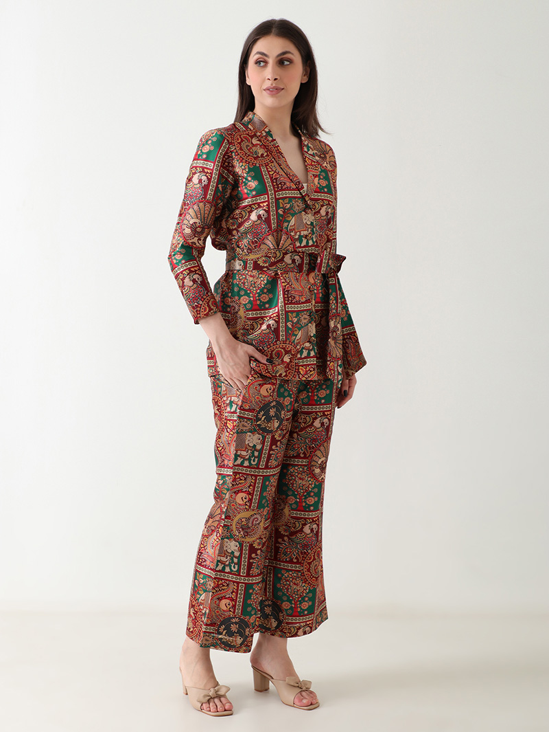 The Regal Heritage Banana Silk Co-ord Set embodies royal charm with its rich tapestry-inspired design. Crafted from luxurious banana silk, it features a lustrous finish with intricate motifs in jewel tones of maroon, green, and gold. The belted V-neck top paired with matching straight-fit pants creates a refined, graceful silhouette. Lightweight, soft, and effortlessly elegant — perfect for festive occasions, dinner gatherings, or high-end casual wear.
