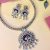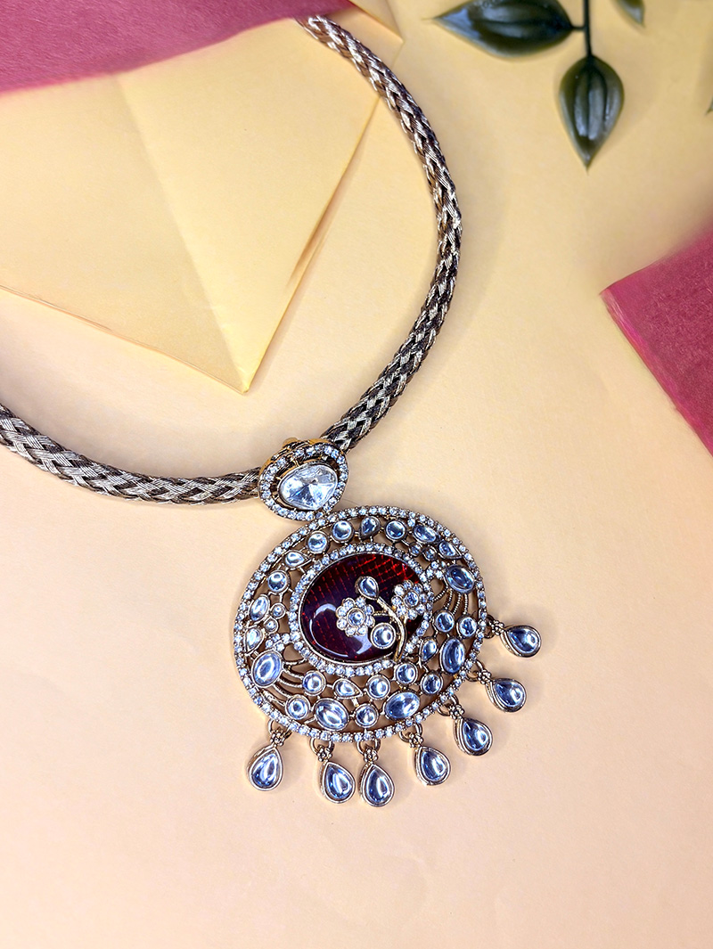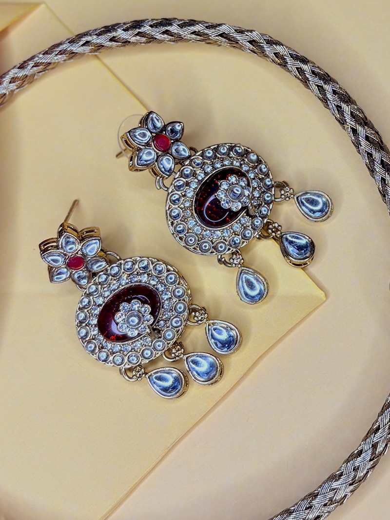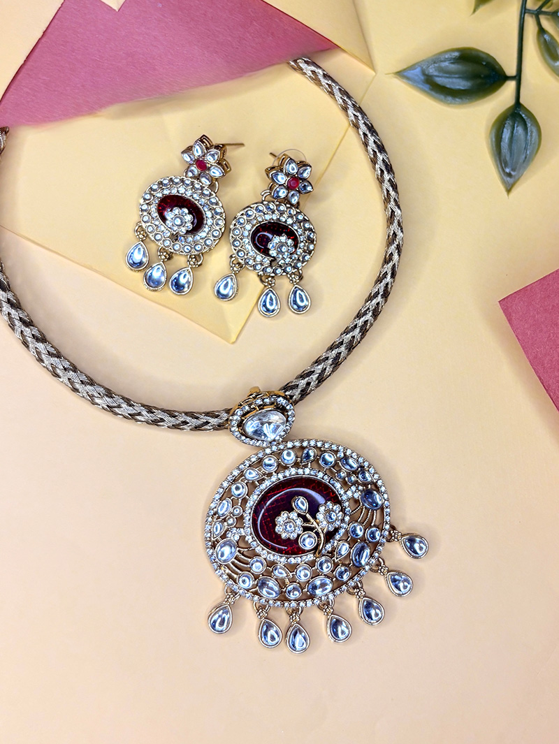 The Royal Kundan Hasuli Set is a magnificent statement piece inspired by traditional heritage jewelry. Featuring a broad woven hasuli-style chain, it is adorned with a large circular pendant encrusted with sparkling kundan stones and finished with dangling teardrop embellishments. The rich maroon enamel center adds depth and elegance to the design. Paired with matching kundan earrings featuring floral motifs and intricate detailing, this set is perfect for brides, festive occasions, and regal celebrations.