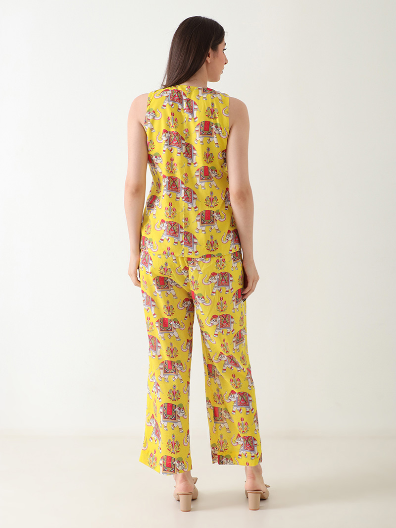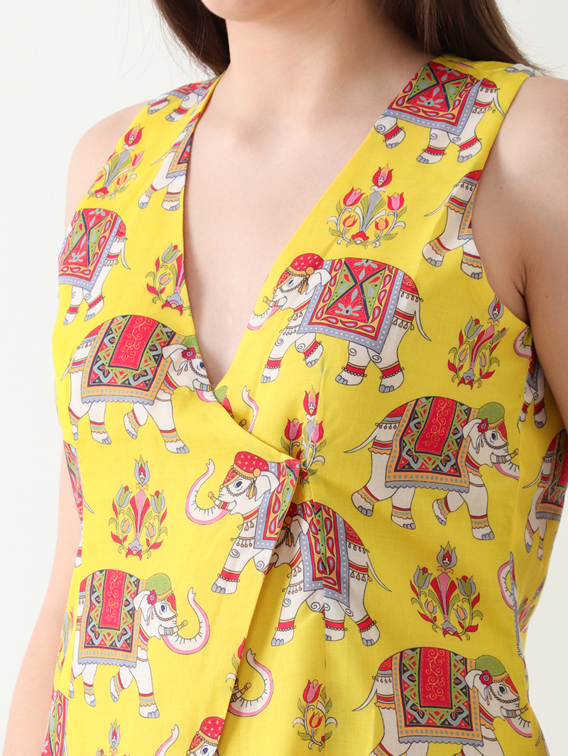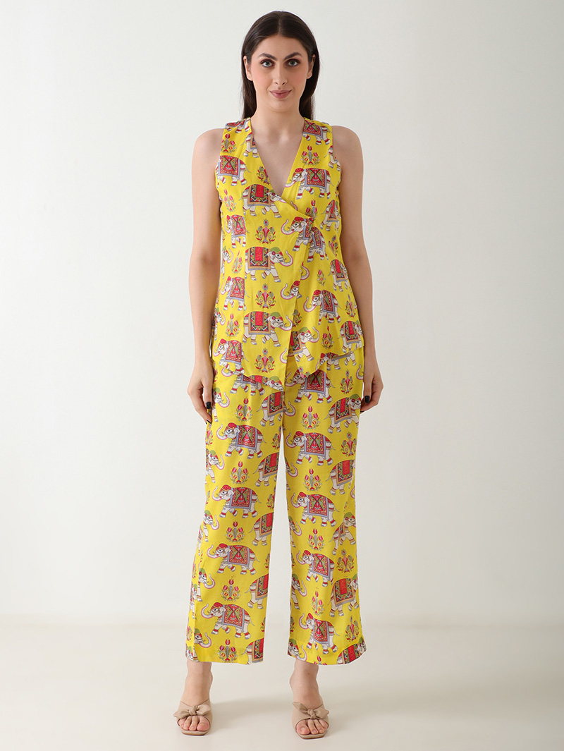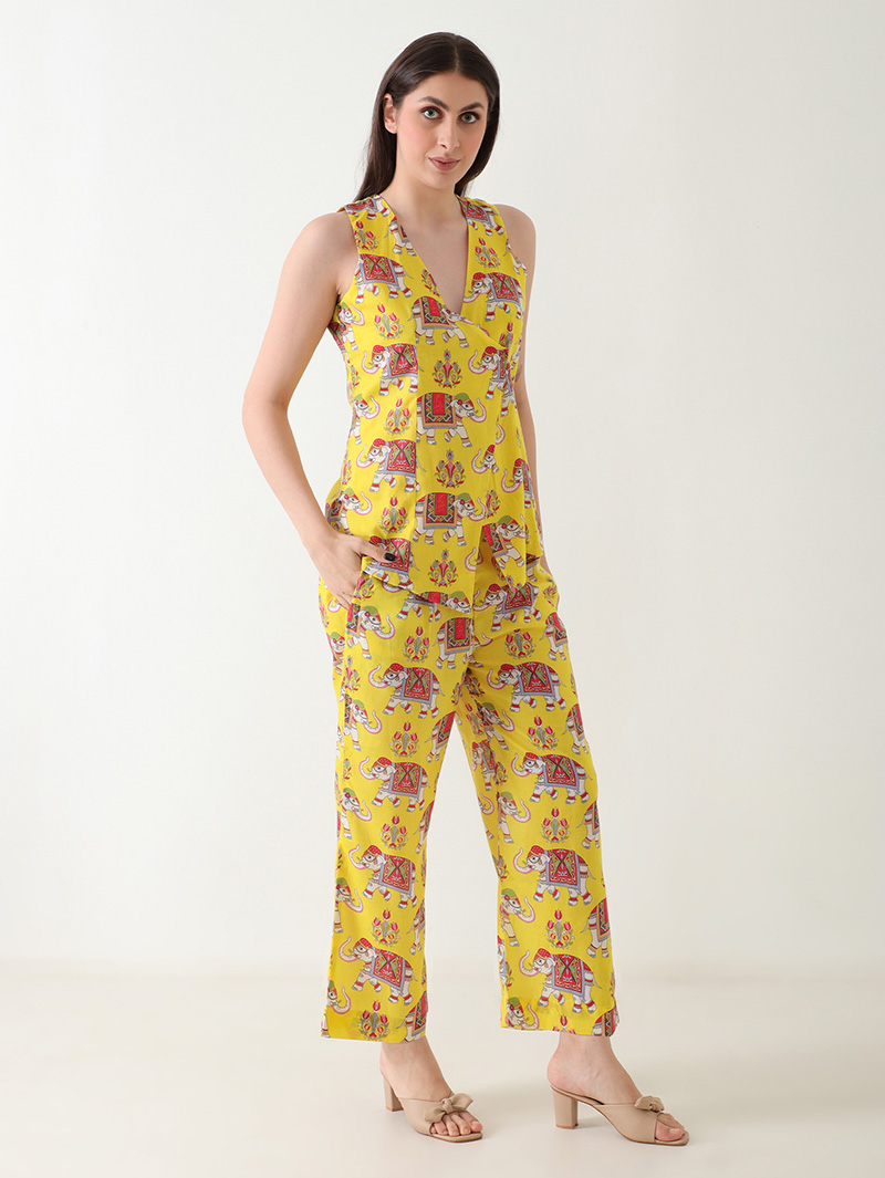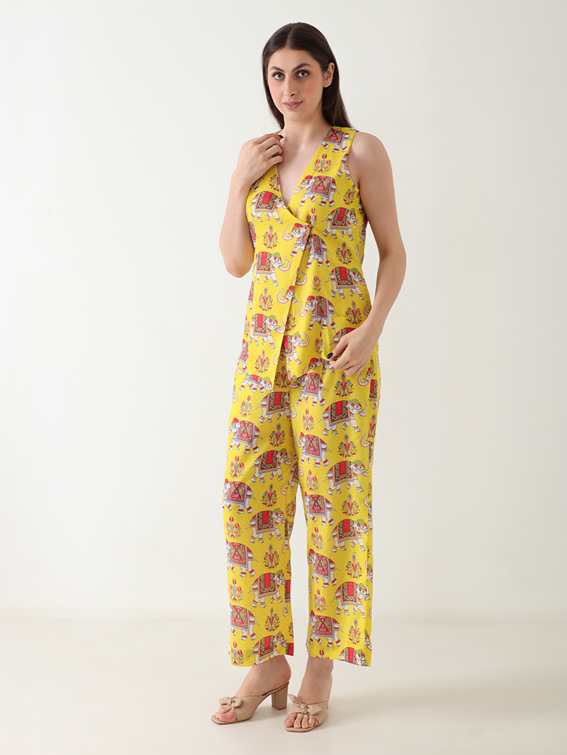Bright, bold, and full of life — the Sunny Safari Linen Co-ord Set is a statement piece that celebrates vibrant artistry. Crafted from breathable premium linen, this sleeveless co-ord set features a playful elephant motif on a sunshine-yellow base. The V-neck overlapping top paired with straight-fit trousers adds both comfort and charm, making it perfect for casual brunches, vacations, or day events where style meets ease.