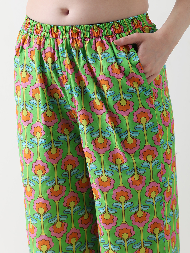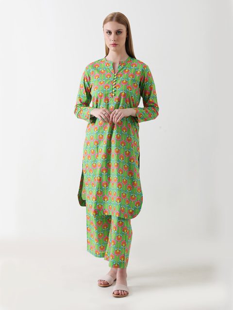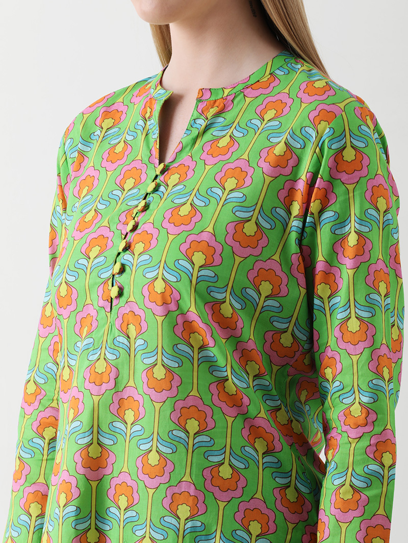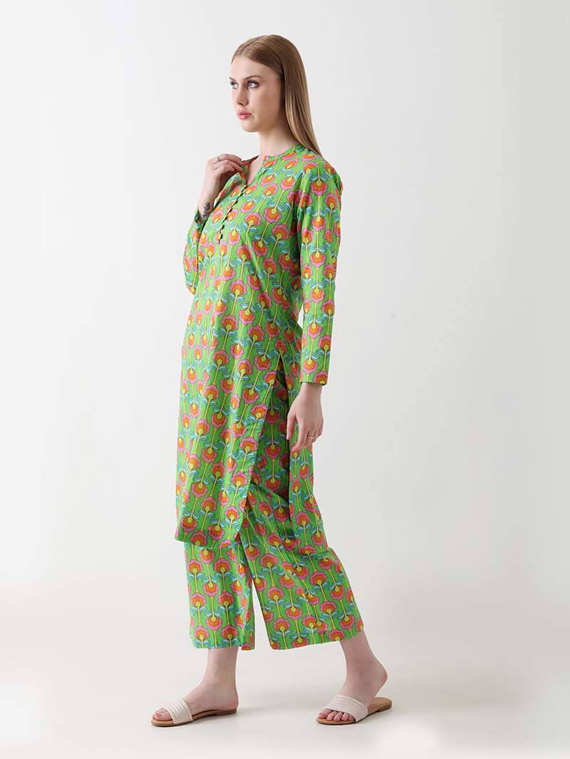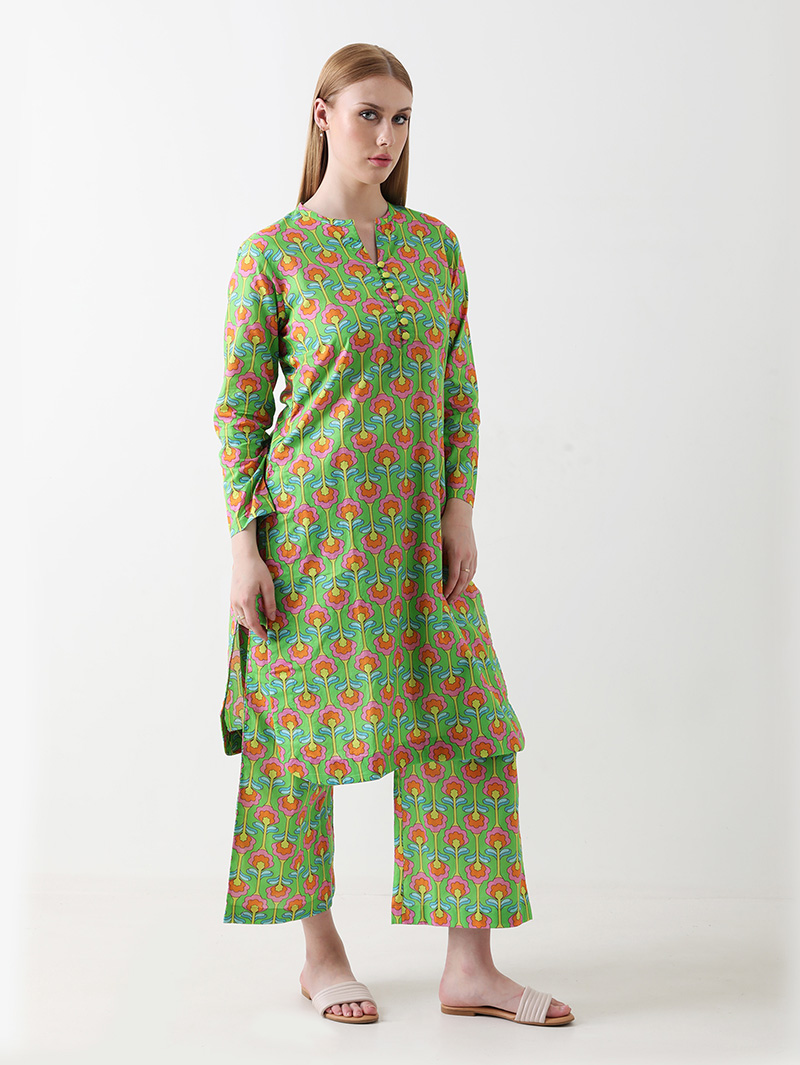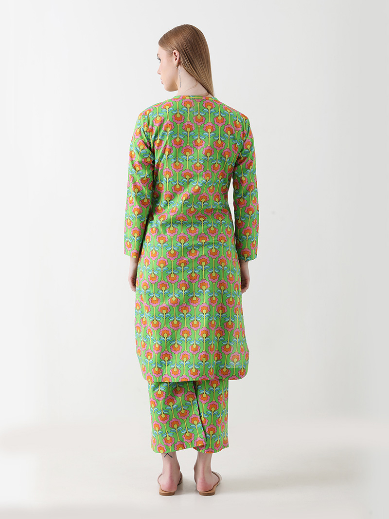 The Tropical Bloom Cotton Kurta Pant Set adds a burst of freshness to your everyday style. Made from soft premium cotton with a digital floral print, it features a vibrant green base adorned with coral and turquoise floral motifs. The straight-cut kurta with button detailing pairs beautifully with matching printed pants, creating a coordinated look that’s equal parts chic and comfortable. Perfect for workwear, casual brunches, or daytime festivities.
