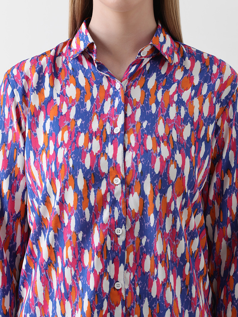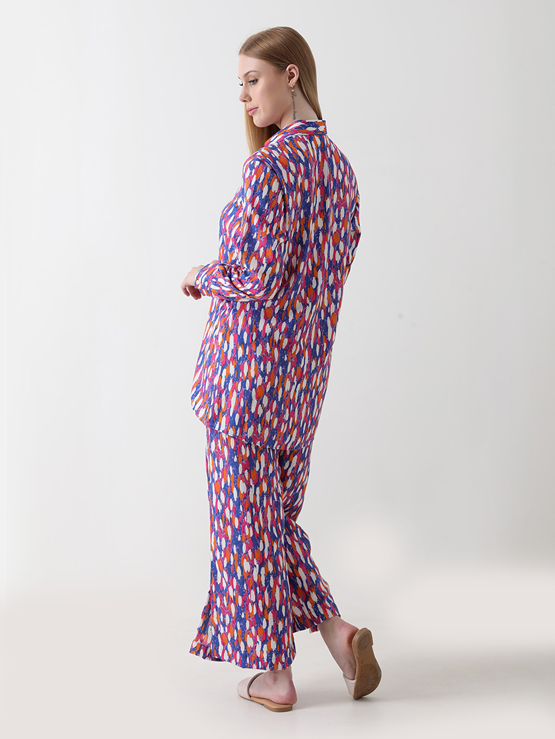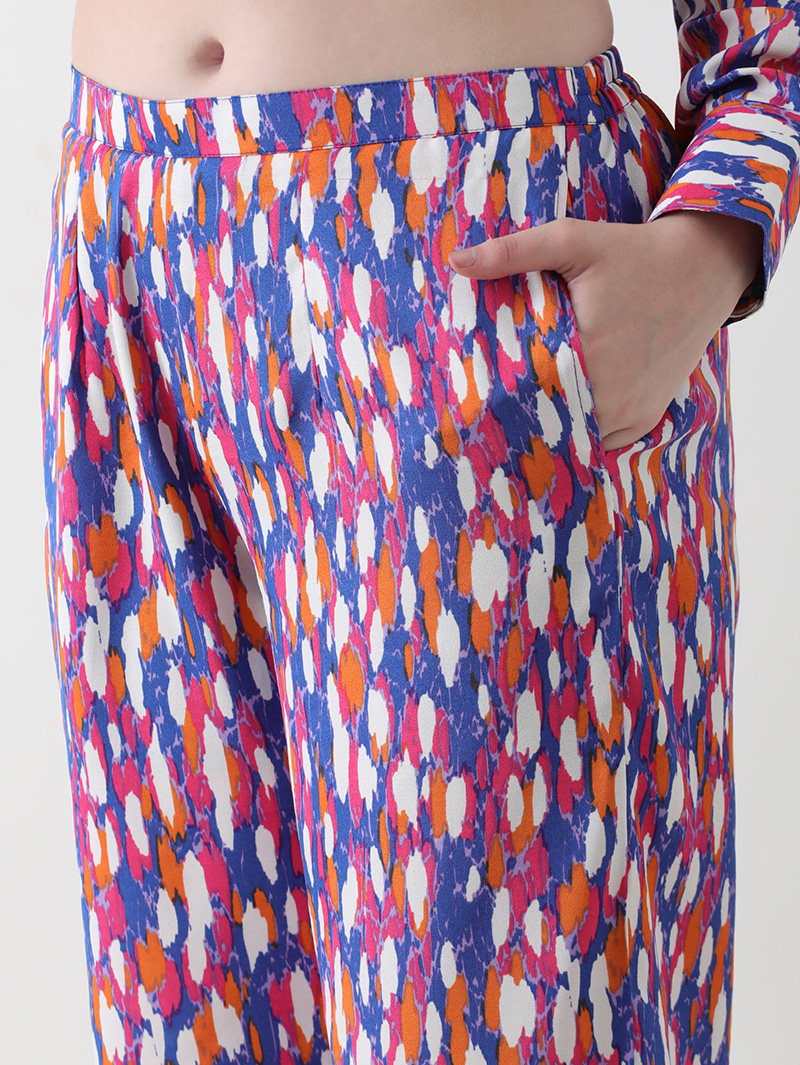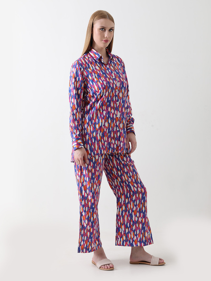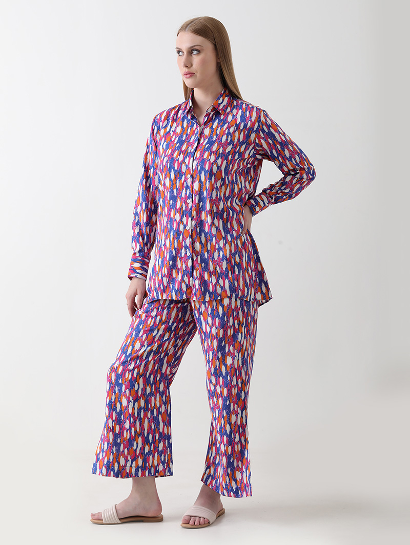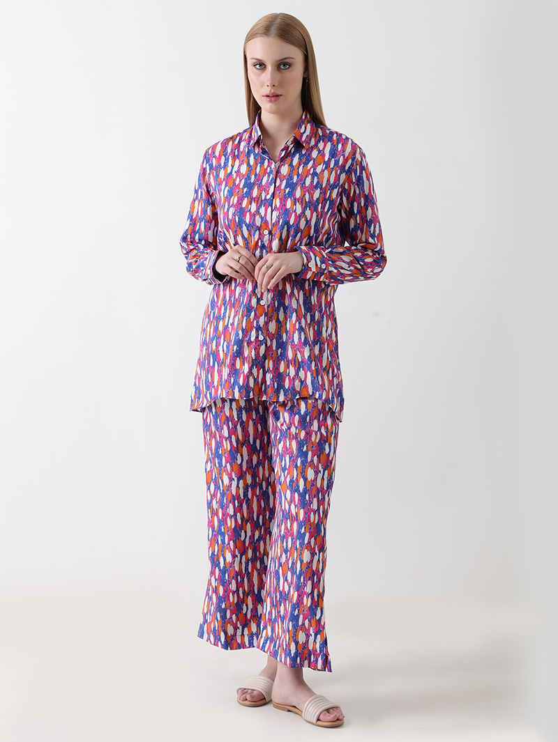 Step into style with our Vibrant Mirage Georgette Co-ord Set, featuring a lively blend of bold hues and abstract patterns. Crafted from lightweight premium georgette, this outfit offers an elegant drape and breezy comfort. The button-down shirt paired with relaxed-fit trousers creates a chic yet easygoing silhouette — perfect for casual brunches, vacations, or day events that call for effortless charm.